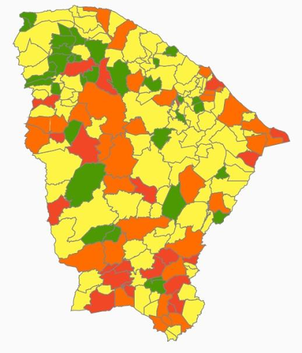 Em relação aos municípios, apenas 34 aparecem com nível 1 de alerta, ou seja, indicadores considerados baixos. Entre eles, estão as cidades de Paracuru, Pacoti, São Luís do Curu e Granjeiro. Algumas das cidades, entretanto, têm tendência de aumento ou estabilidade na incidência de casos.