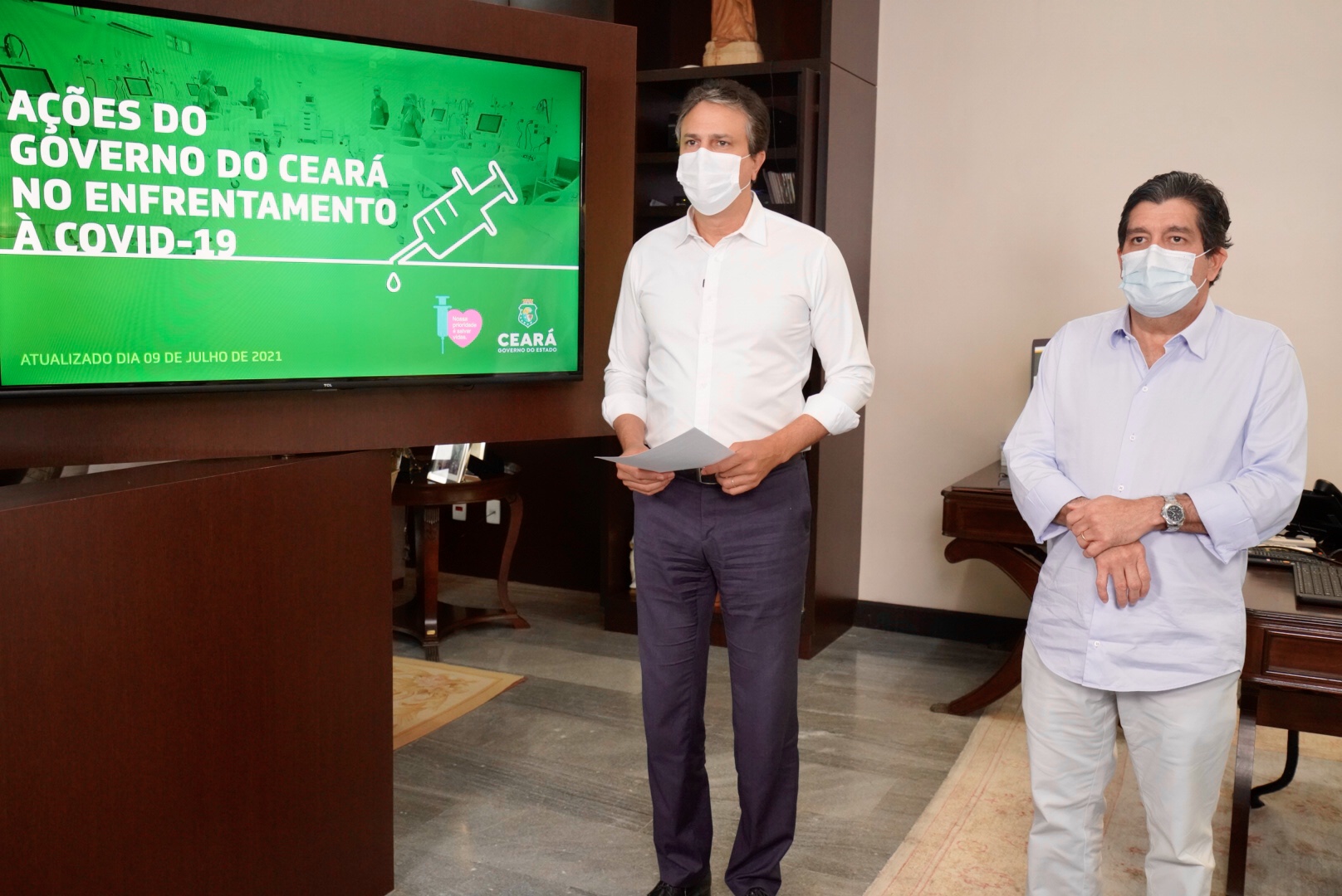 O governador do Ceará, Camilo Santana, anunciou no início da tarde desta sexta-feira (9), por meio de transmissão ao vivo nas redes sociais, a atualização do decreto estadual com medidas de combate à Covid-19. Entre as novidades, a ampliação do horário do comércio de rua e de shopping. Ao lado do governador estava o secretário da Saúde do Estado, Carlos Roberto Martins Rodrigues Sobrinho (Dr. Cabeto).