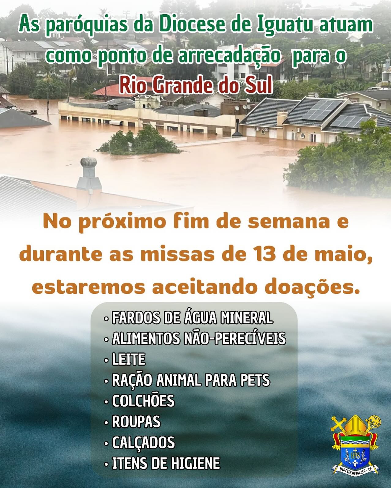 As paróquias da Diocese de Iguatu-CE, estão em parceria com outras instituições civis e militares em campanha de arrecadação para os irmãos do Rio Grande do Sul.