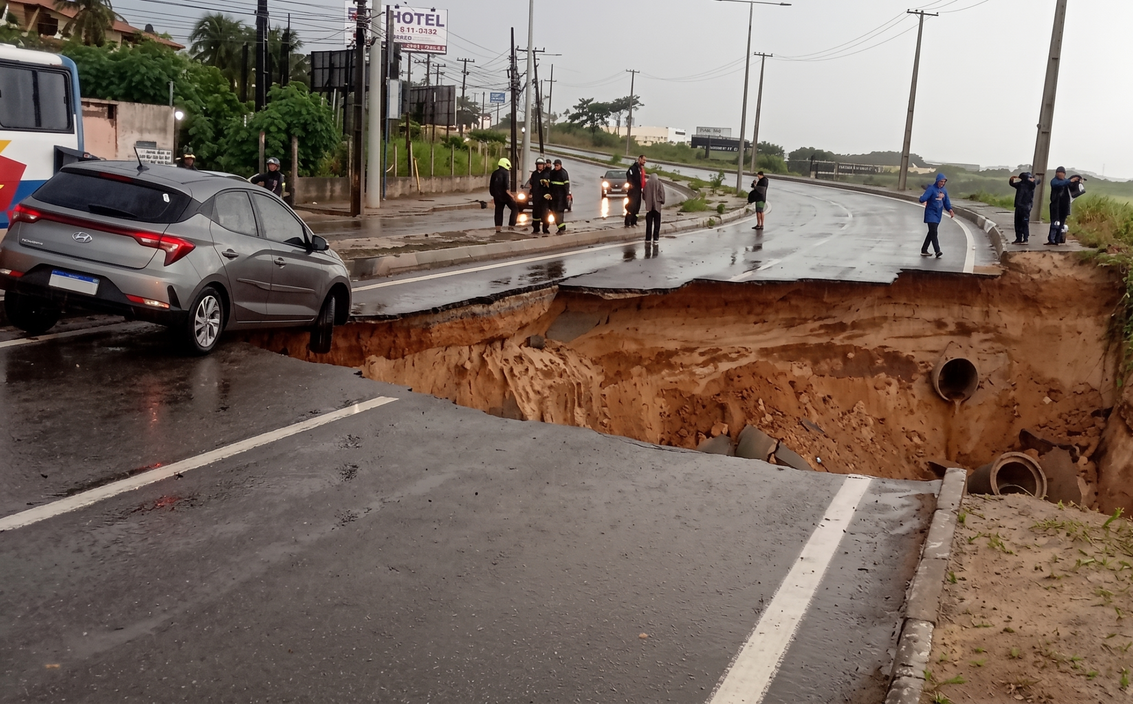 As fortes precipitações que atingem alguns municípios do estado do Ceará desde a madrugada desta segunda-feira (27) provocaram uma tragédia na rodovia CE-025, principal via de ligação entre Fortaleza e o município de Eusébio. Devido à intensidade das águas, um trecho da estrada não resistiu e cedeu completamente, abrindo uma enorme cratera que tragou ao menos três veículos que trafegavam pela região no momento do colapso. O incidente ocorreu especificamente no acesso que leva ao Porto das Dunas e ao complexo turístico Beach Park.