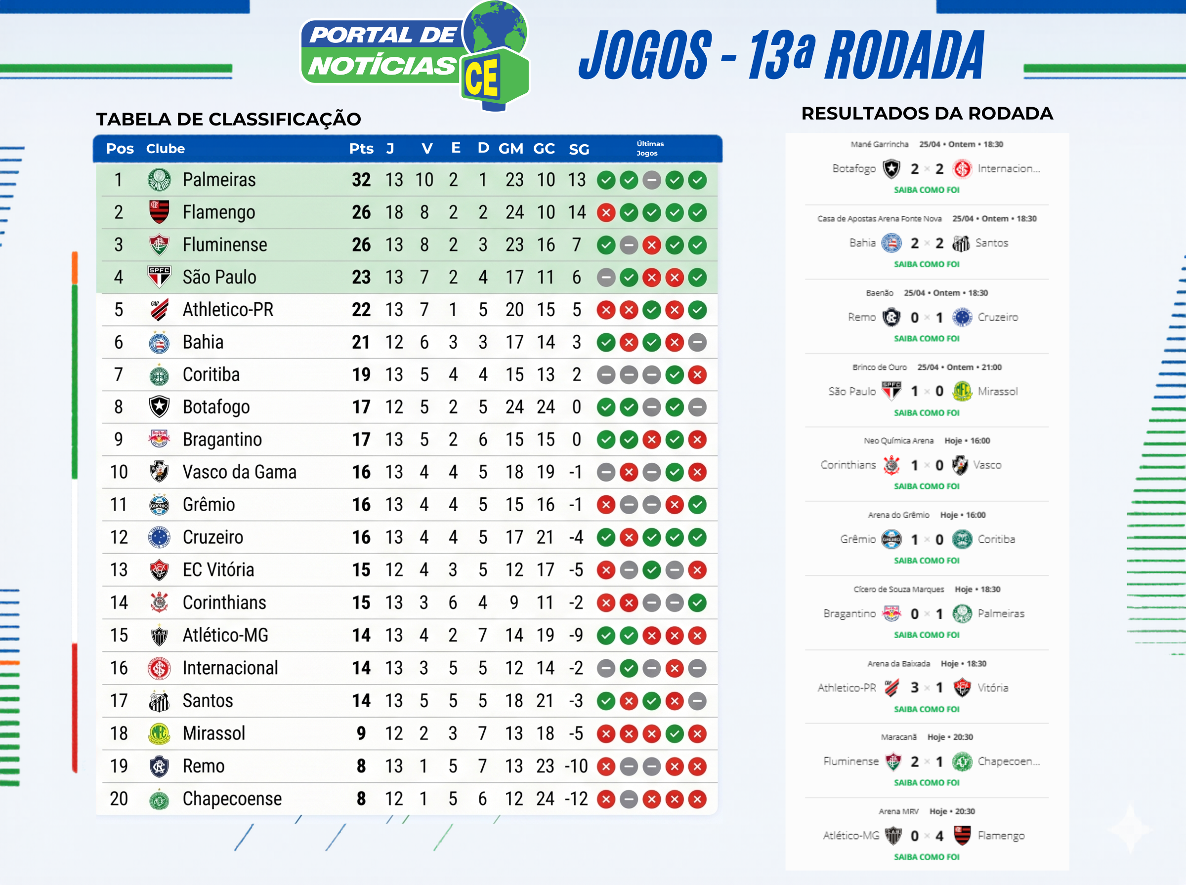 Confira a Tabela  e os Resultados da 13ª Rodada